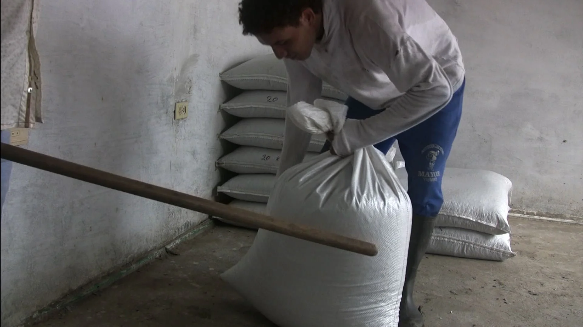 In a single shot, steadily observing friends at work, hoisting bags of sunflower seeds, the artist films a chance encounter between species. Because the humans are in charge it ends predictably with colonial domination, fear and death. The artist returns us to moments of synchronized sounds only at the points of interspecies contact.