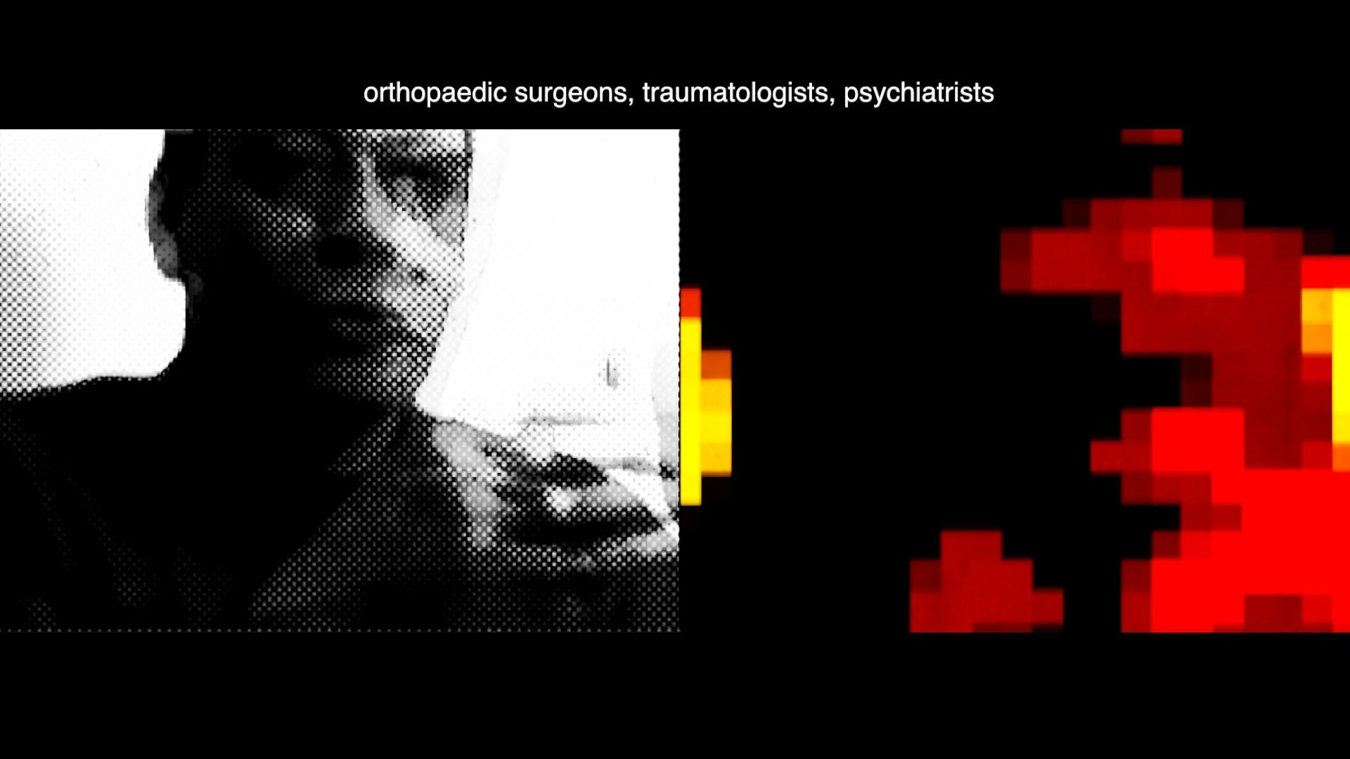 A double-sided work of philosophy and grieving. The artist films a street procession by actors at the Cali Theatre School, mourning the loss of Harold Monaco, murdered by paramilitaries in the endless night of the civil war. Wearing whiteface, they do not speak, but solemnly fill the street with their vulnerable bodies and feelings. Jorge adds a voice-over that speaks as if from the mouth of Monaco himself. In part 2 he lays computer text over a suite of lab rat experiments and military landscapes to muse on Baudrillard’s control scenario simulations.